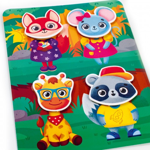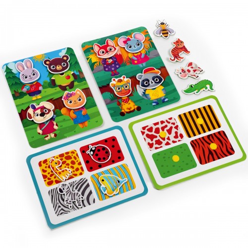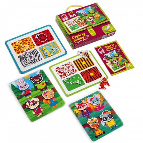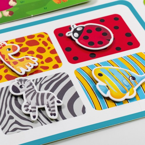 Zebra w czarno-białe paski i zielony krokodyl z plamkami. Przymocuj zwierzęta do plansz do gry z ich kolorem. Gotowe!