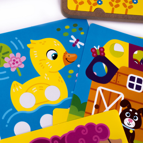 Specjalna drewniana podstawa do mozaiki zapewnia komfort i stabilność podczas gry. Dziecko będzie mogło z łatwością połączyć elementy. Zdejmowane kolorowe podstawy są umieszczane na drewnianej, zmieniając opcje gry.