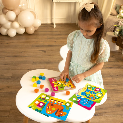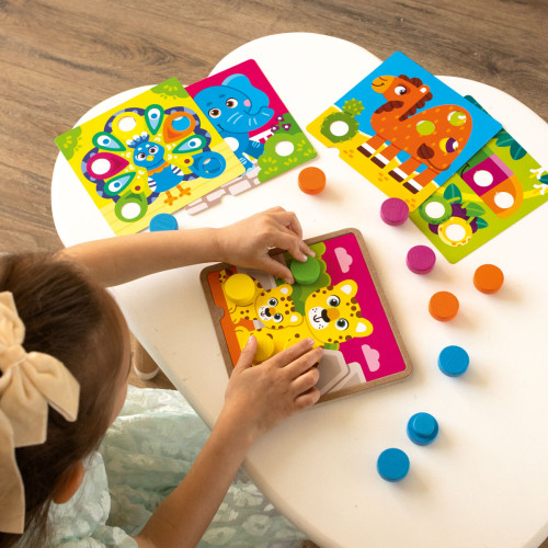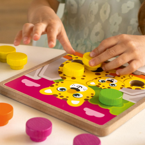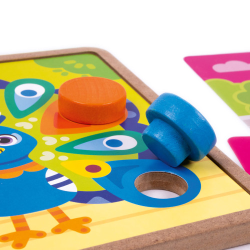 Specjalna drewniana podstawa do mozaiki zapewnia komfort i stabilność podczas gry. Dziecko będzie mogło z łatwością połączyć elementy. Zdejmowane kolorowe podstawy są umieszczane na drewnianej, zmieniając opcje gry.