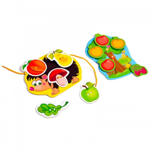 Przy pomocy rzepek umocujcie jabłuszka i inne smakołyki do planszy- bazy. A za pomocą sznurka płody natury do figurki jeżyka. Ile jabłuszek niesie na grzbiecie? Policzcie.