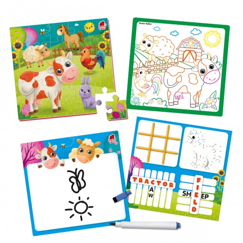 Rysuj, układaj puzzle i wykonuj zadania na dwustronnej planszy ze zwierzętami z farmy. Zestaw dostarczy dziecku wiele emocji.