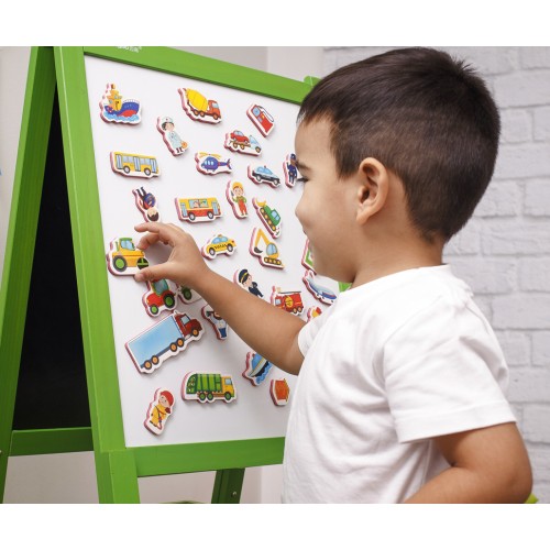 Tematyczny komplet magnesów zapozna dziecko z różnymi środkami transportu. Znakomite ilustracje, zrozumiałe dla dzieci obrazki, objętościowe magnesiki, grube, łatwe do pobierania do dzicięcej ręki i przesuwania z miejsca na miejsce. Łatwo mocują się do dowolnej metalowej powierzchni. Gra z magnesami rozwija małą motorykę rąk, myślenie twórcze, rozszerza pojęcie o otaczającym świecie i powiększa słownictwo dziecka.