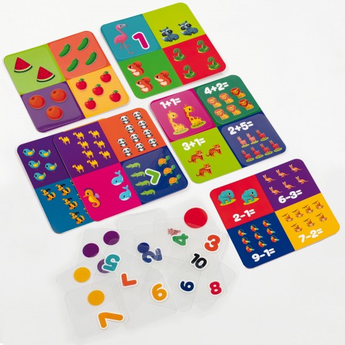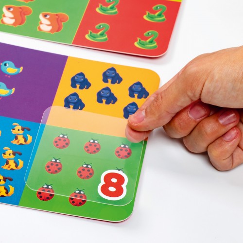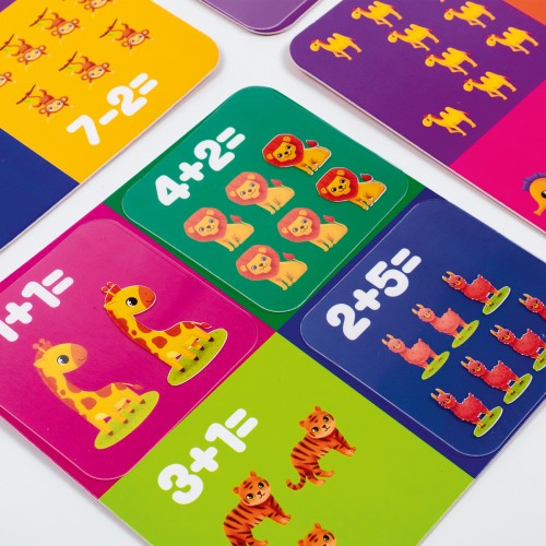 Główne karty przedstawiają zwierzęta i przykłady. A na przezroczystych plastikowych kartach są odpowiedzi na przykłady.